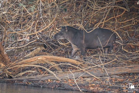 But we were very much in Brazil, as was evidenced by the Kayapó native guides we worked with each day on the river. Each day we motored from the home pool in front of the lodge either upsteam or downstream to our assigned beat, and the drive ended up being one of my favorite parts of the routine. It was a wildlife safari each time; over the course of two weeks we see jaguar, puma, tapir, giant river otters, capybara, caiman, turtles, rays, electric eels, red water snakes, macaws, and more.
